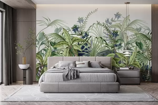 Fototapet Arrangemang av olika tropiska växter med stora gröna blad, vilket skapar en frodig lövverksscen på en ljus beige Nr. w08777