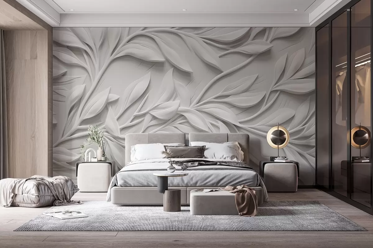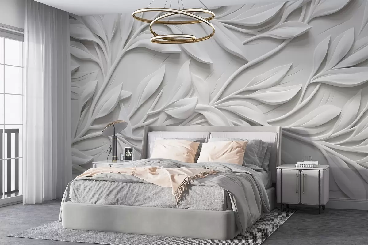 Fototapet Vitt texturerat tryck med löv och grenar som skapar en voluminös imitationseffekt på en texturerad bakgrund Nr. w08778