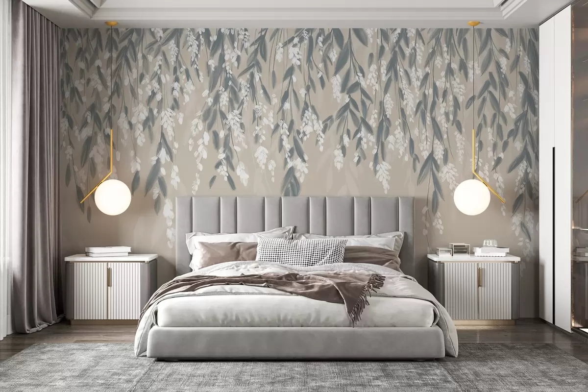 Fototapet Kaskadformade lövverksgrenar i dämpade gröna nyanser med vita blommor och blad på beige bakgrund Nr. w08781