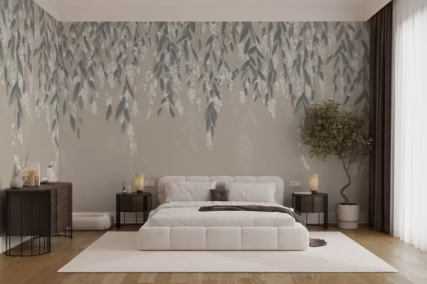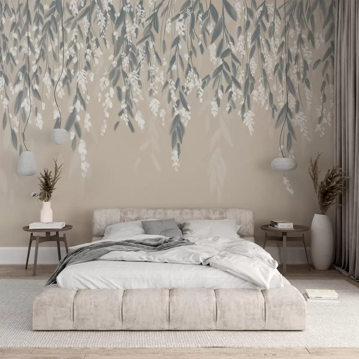Fototapet Kaskadformade lövverksgrenar i dämpade gröna nyanser med vita blommor och blad på beige bakgrund Nr. w08781