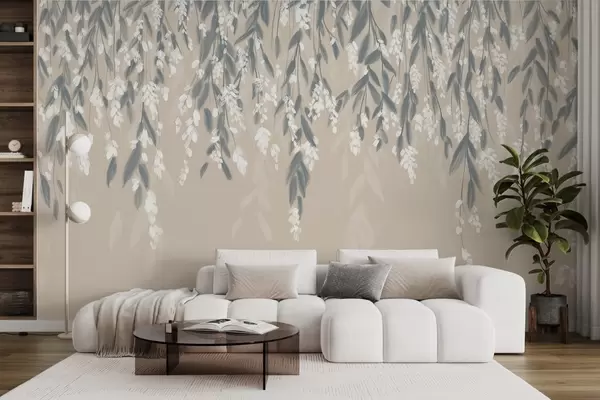 Fototapet Kaskadformade lövverksgrenar i dämpade gröna nyanser med vita blommor och blad på beige bakgrund Nr. w08781