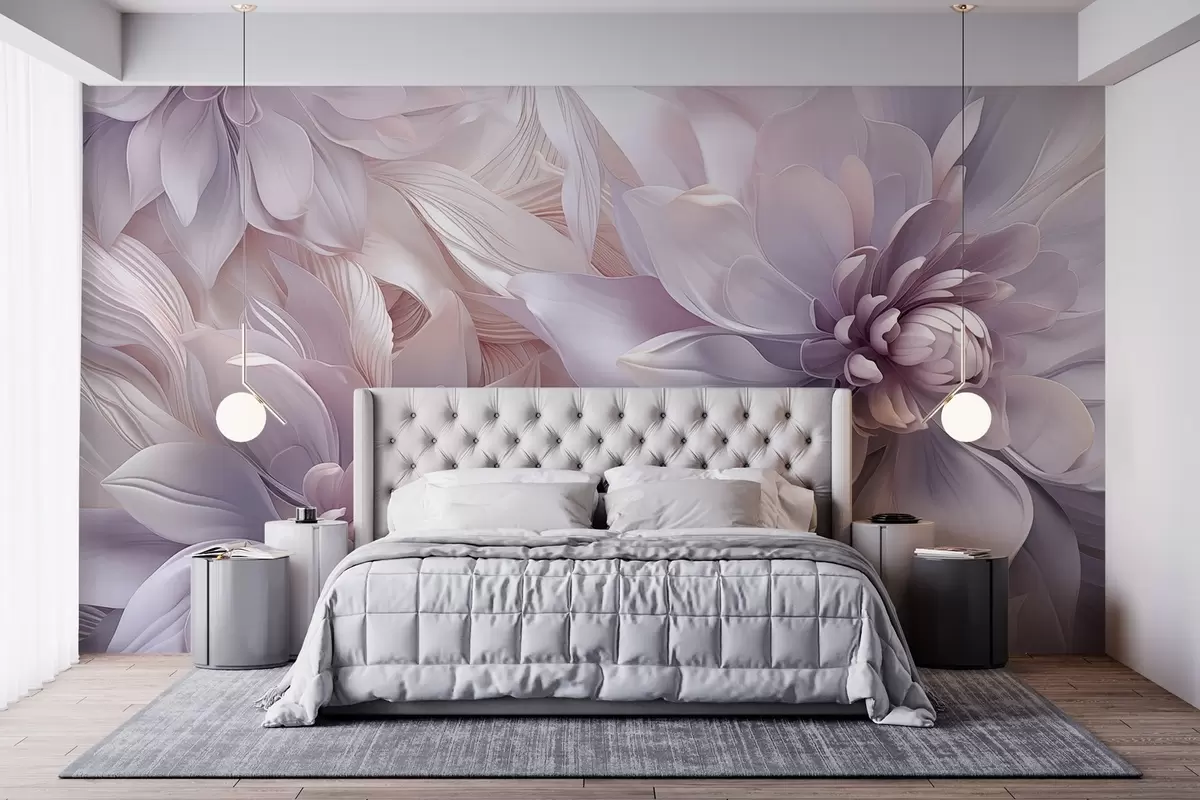 Fototapet Mjuka, skiktade blommor i nyanser av ljusrosa, lavendel och vitt med fina kronblad och intrikata detaljer Nr. w08783