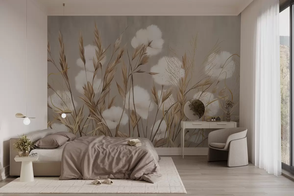Fototapet Mjuka, fluffiga vita bomullsblommor och högt orange spikeletsgräs mot en dämpad texturerad beige bakgrund Nr. w08784