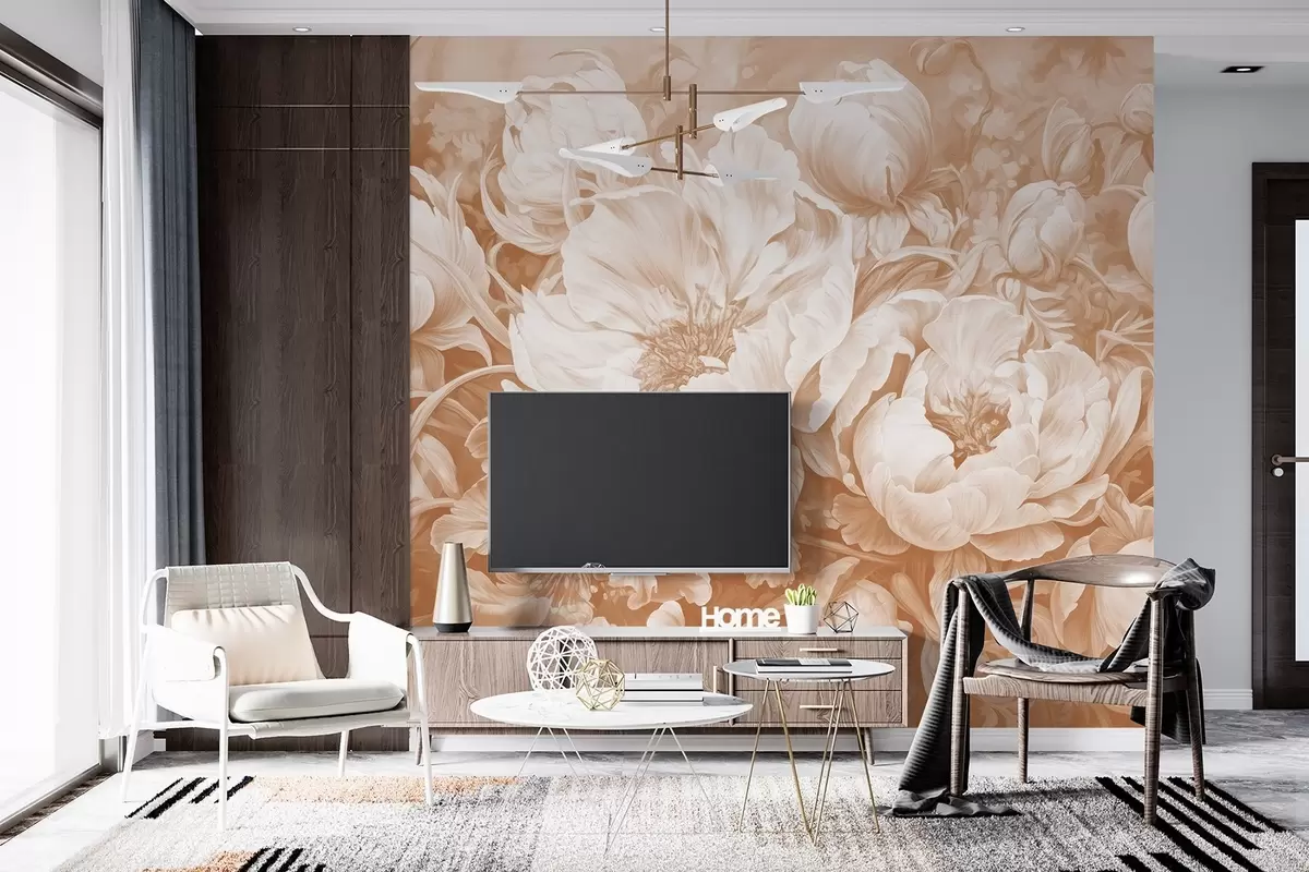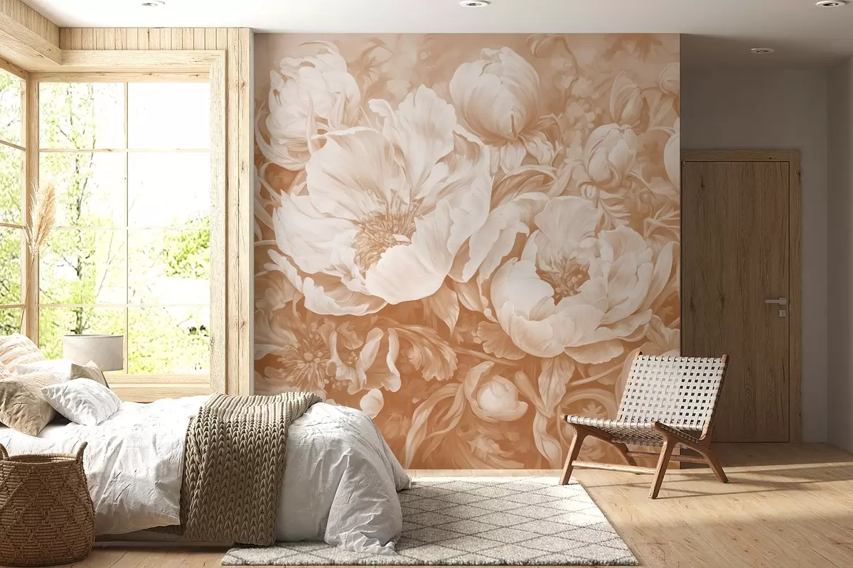 Fototapet Tulpaner och pioner, en blommig komposition i beige oljestil med penseldrag Nr. w08817v1