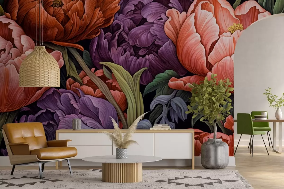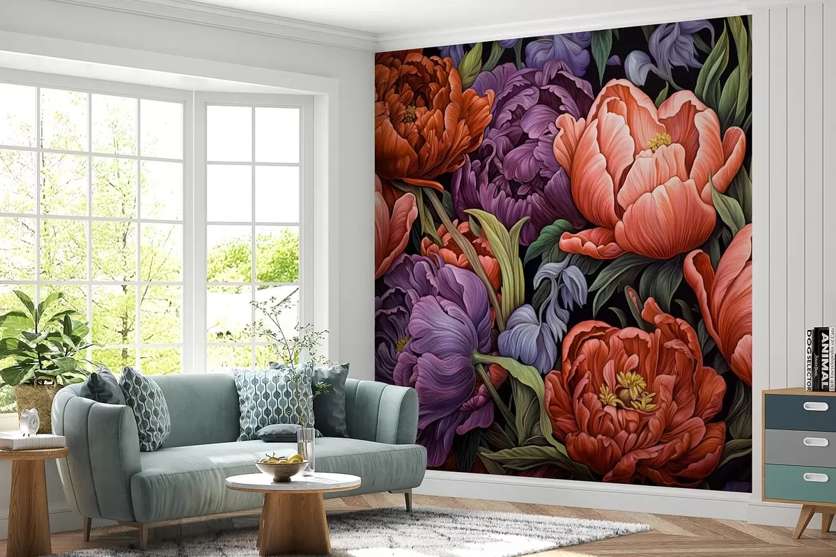 Fototapet Tulpaner och pioner i viktoriansk stil, i röda och lila färger Nr. w08818v1