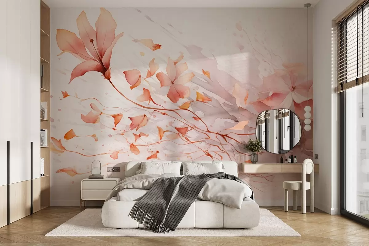 Fototapet En blomma med fallande kronblad i en akvarellstil i varma toner Nr. w08821v1