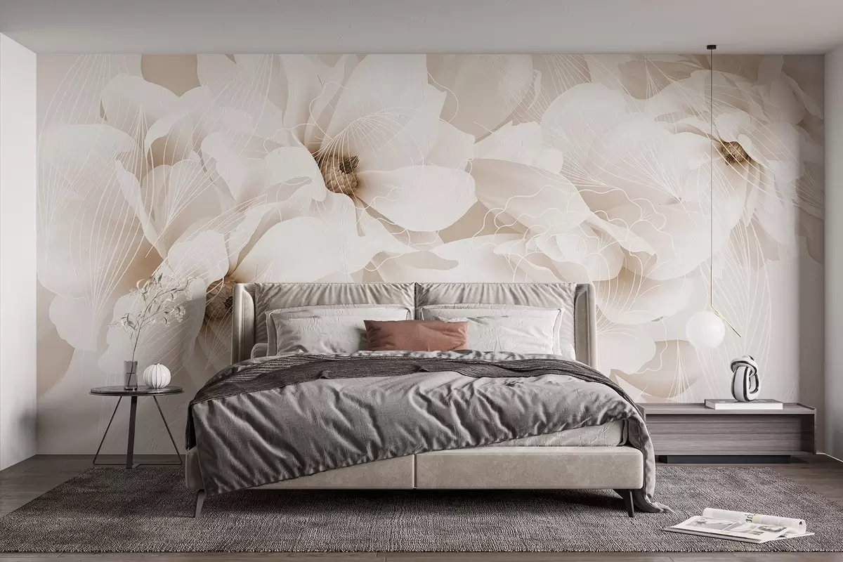 Fototapet Pastellfärgade pionblommor med vita och beige fina kronblad och vita linjer på en ljusbeige bakgrund Nr. w08826v1