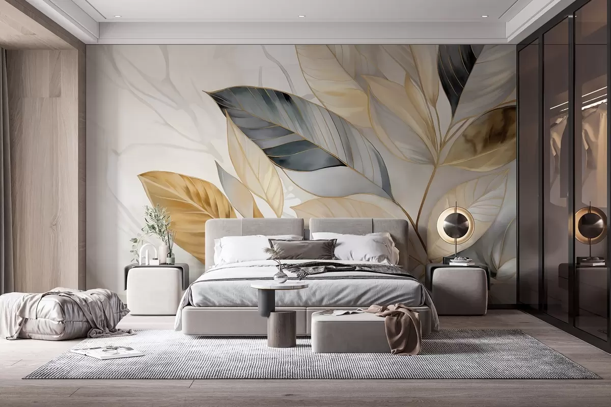 Fototapet Gula, grå och vita skira stora blad på en vit abstrakt texturerad bakgrund Nr. w08828