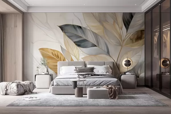 Fototapet Gula, grå och vita skira stora blad på en vit abstrakt texturerad bakgrund w08828