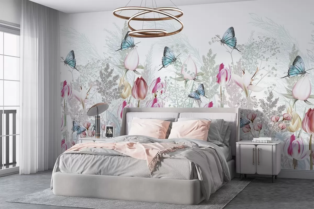 Fototapet Pastelligt tryck med tulpanblommor, gräs och fjärilar som flyger i en trädgård Nr. w08834