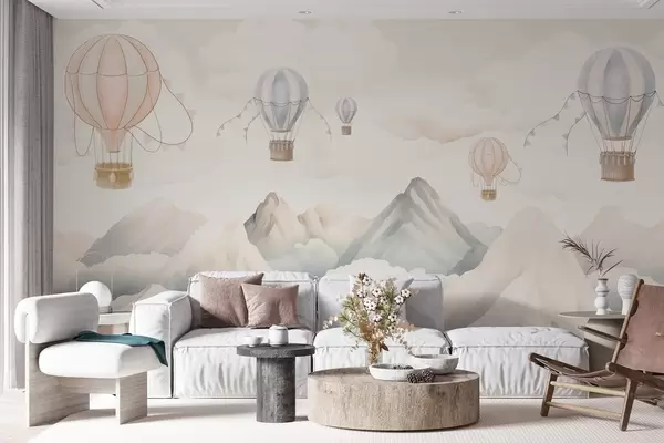 Fototapet Varmluftsballonger som svävar över berg i neutrala, mjuka pastellfärger w08853