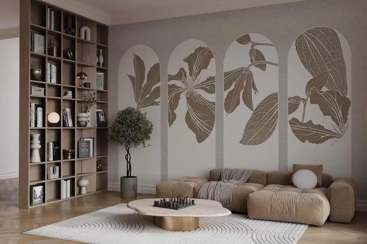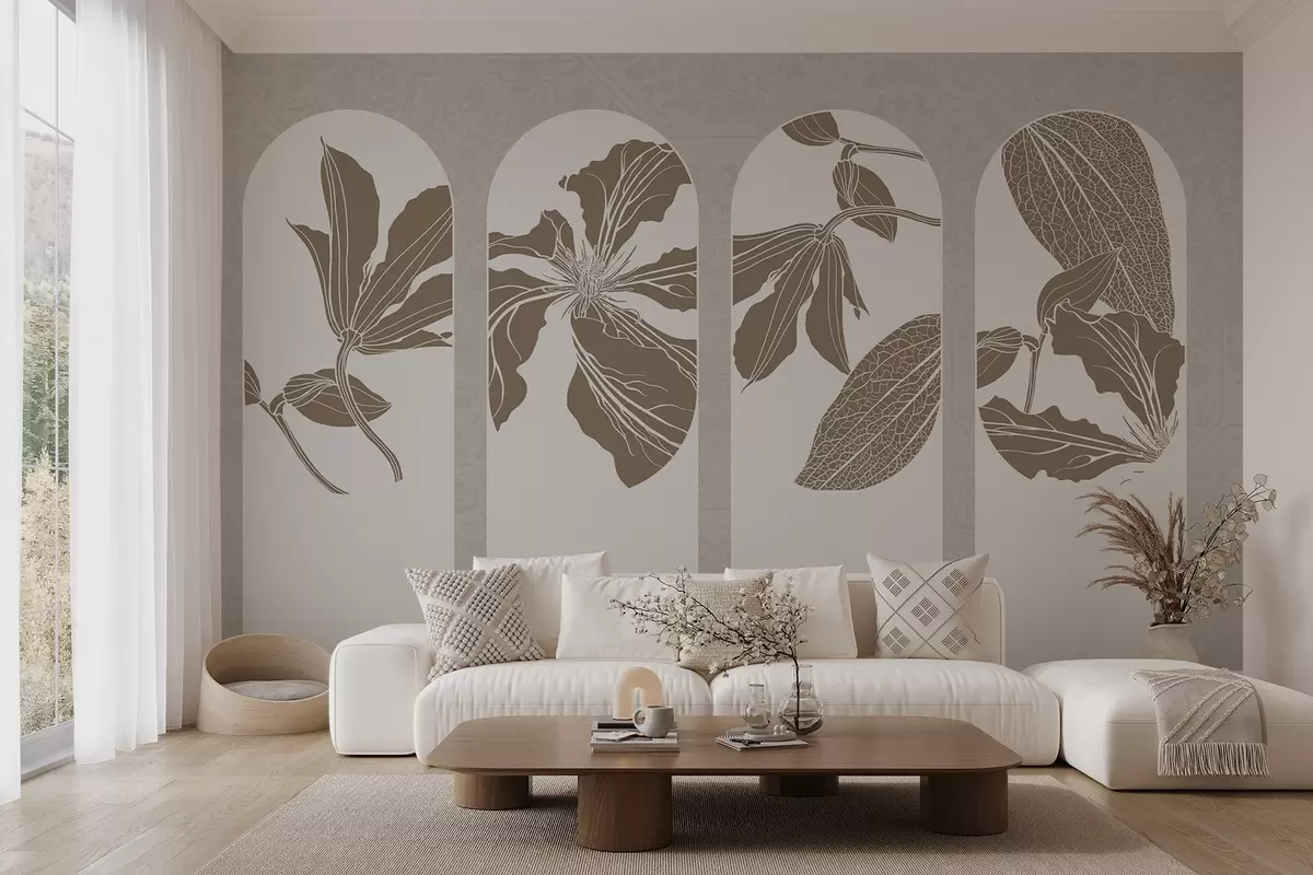 Fototapet Eleganta bågar med blommönster i beige och vitt, mot en strukturerad beige bakgrund, minimalistisk stil Nr. w08866