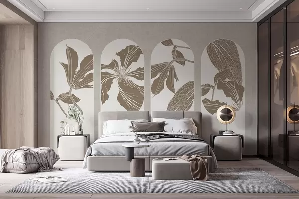 Fototapet Eleganta bågar med blommönster i beige och vitt, mot en strukturerad beige bakgrund, minimalistisk stil Nr. w08866