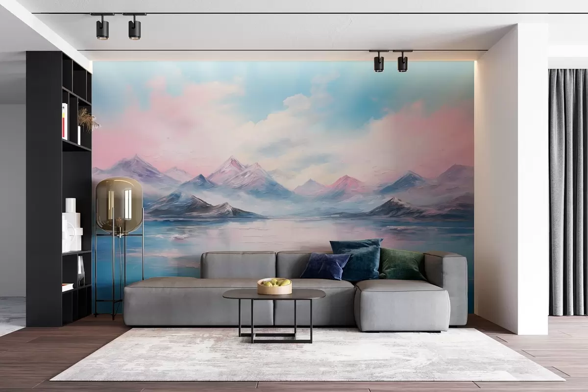 Fototapet Ett färgglatt landskap med penseldrag i rosa och blå toner, med berg, en sjö och moln Nr. w08878
