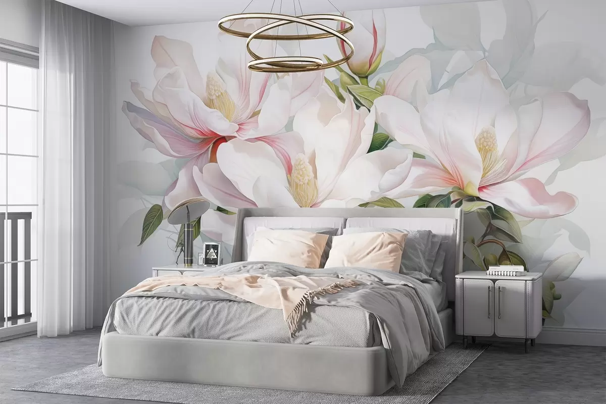 Fototapet Magnoliablommor med vita och rosa kronblad, blad och bruna grenar, mjuk och känslig akvarellstil Nr. w08885