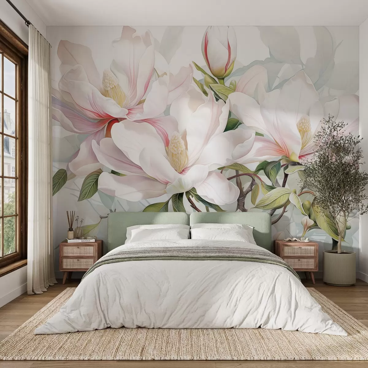 Fototapet Magnoliablommor med vita och rosa kronblad, blad och bruna grenar, mjuk och känslig akvarellstil Nr. w08885