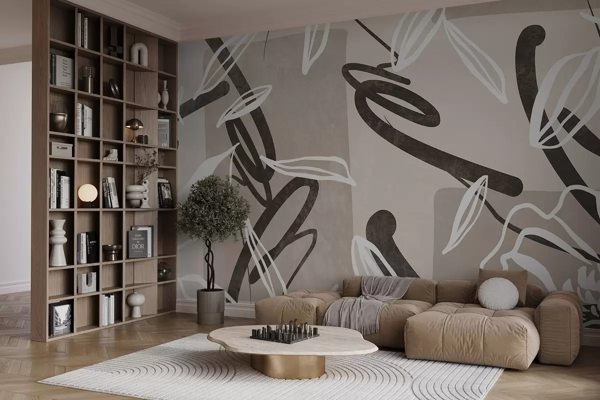 Fototapet Abstrakt texturerad modern och minimalistisk design med blommiga element i en neutral beige färgpalett Nr. w08888