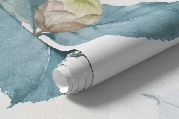 Fototapet Blommor i delikat akvarellstil med vita och beige kronblad och gröna blad på en gren, ljus bakgrund Nr. w08895