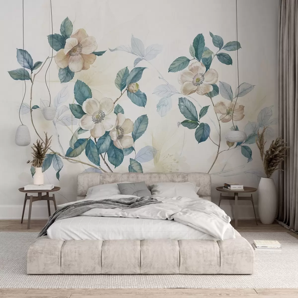Fototapet Blommor i delikat akvarellstil med vita och beige kronblad och gröna blad på en gren, ljus bakgrund Nr. w08895