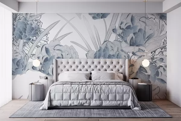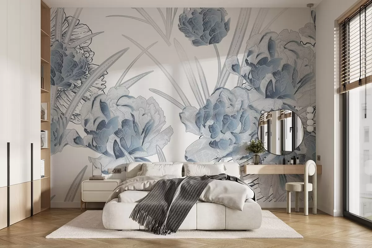 Fototapet Blå pioner med blad på en vit bakgrund, blommig design, botanisk illustration Nr. w08896