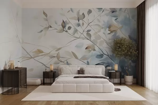 Fototapet Grenar med blad i blå och bruna toner, ljus bakgrund, mjuk och skir, akvarellstil Nr. w08900