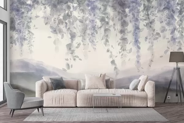Fototapet Blåregn hänger över blå berg, mjuka pastellfärger i blått och grått, landskap i akvarellstil w08909