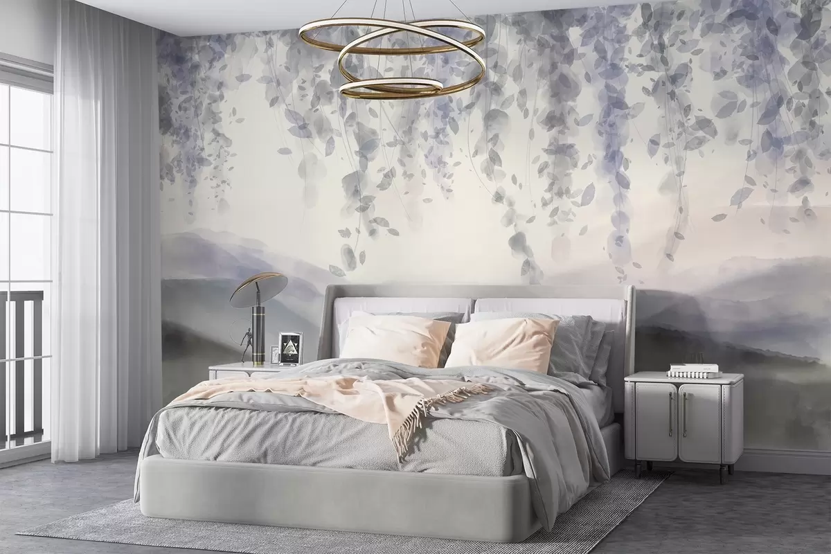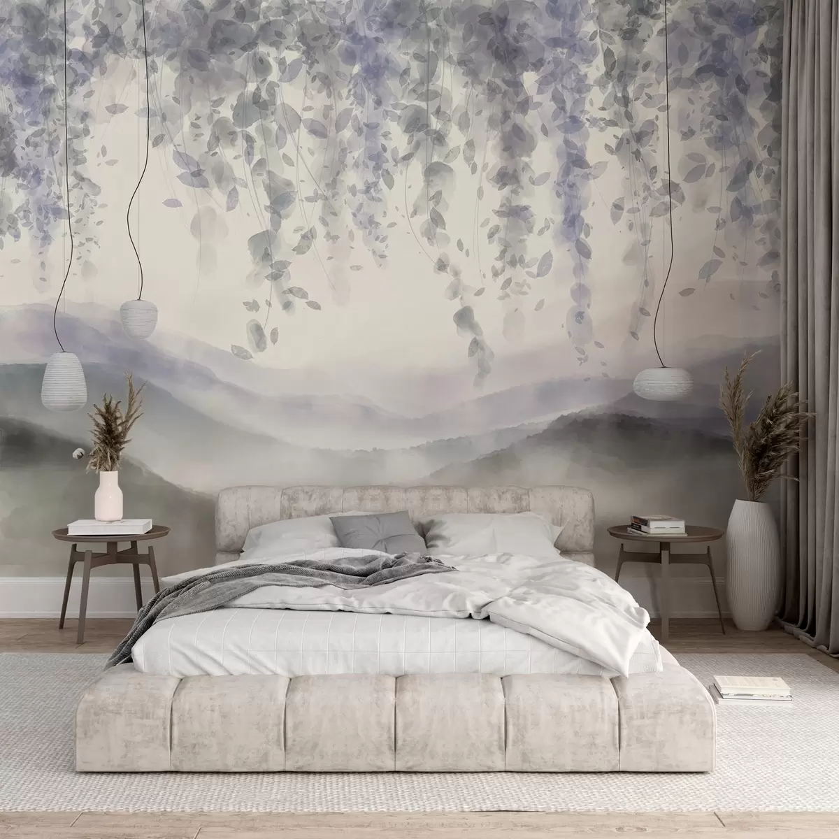 Fototapet Blåregn hänger över blå berg, mjuka pastellfärger i blått och grått, landskap i akvarellstil Nr. w08909