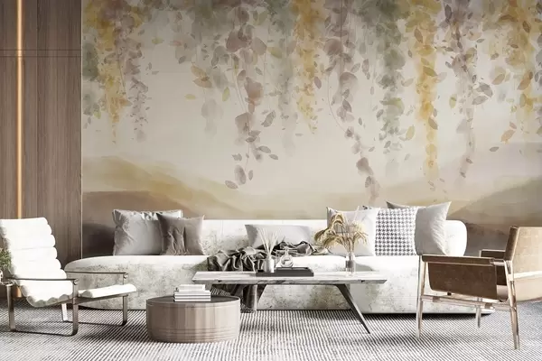 Fototapet Blåregn hänger över blå berg, mjuka pastellfärger i gult och brunt, landskap i akvarellstil Nr. w08909v1