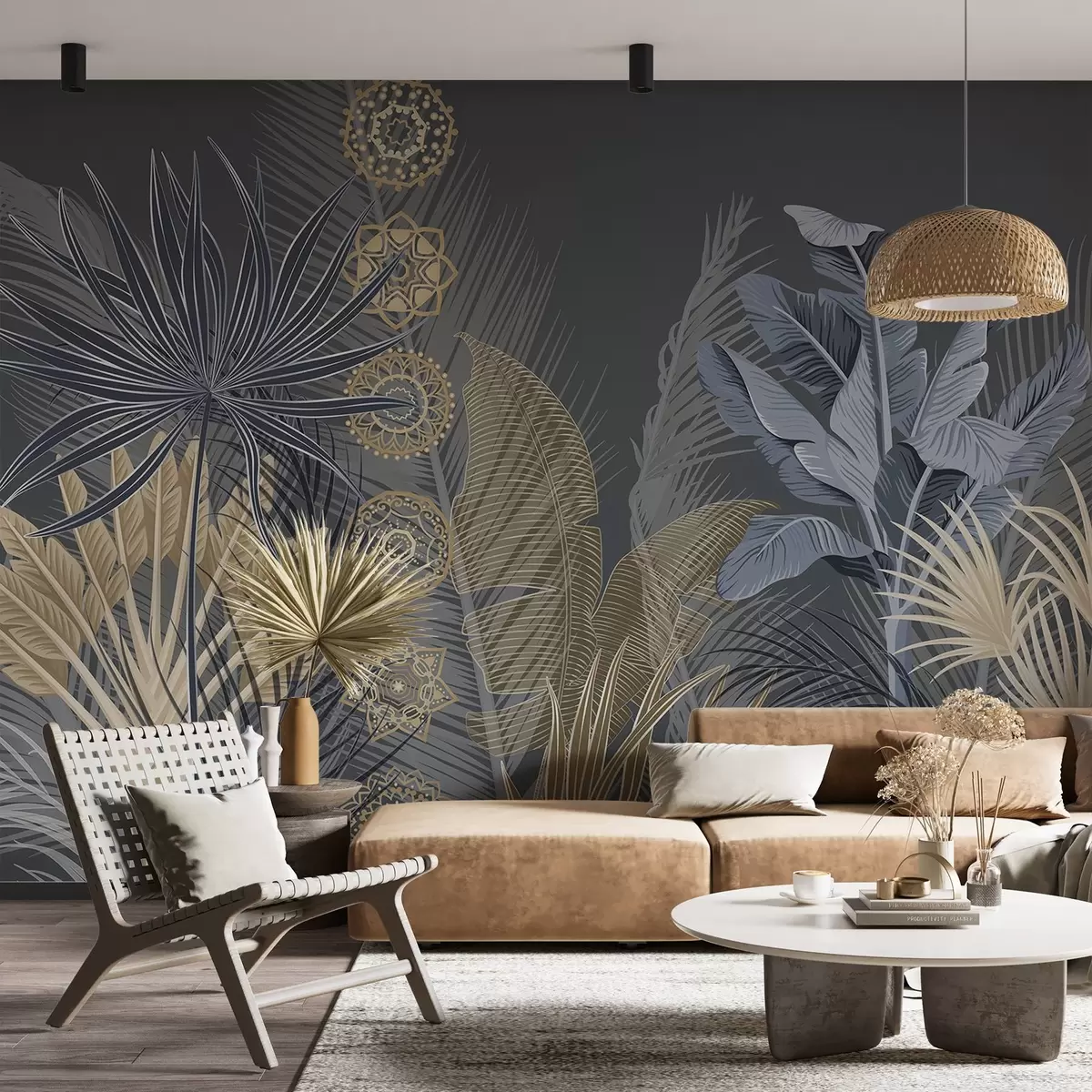 Fototapet Tropiska blad i blå och bruna toner, palmblad, bananblad och mandalaornament, mörk bakgrund Nr. w08913