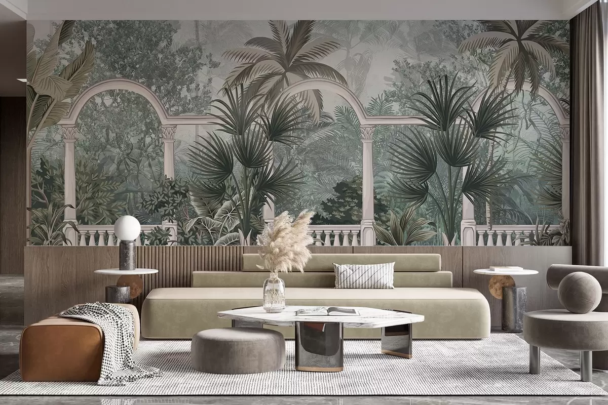 Fototapet Tropisk texturerad trädgård med palmer och frodig vegetation, balustrad med bågar, dämpade färger, vintagestil w08916
