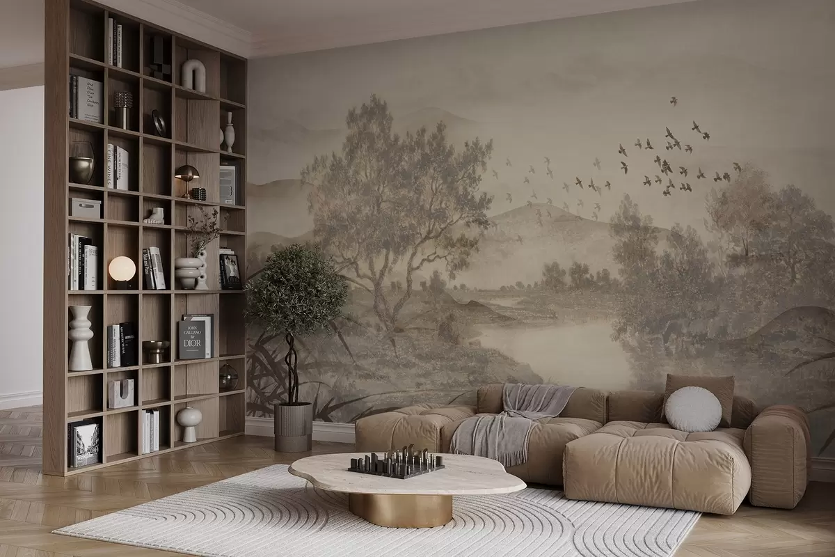Fototapet Texturerat vintagelandskap med ett träd nära en flod och en molnig himmel, naturkonst i sepiatoner Nr. w08920