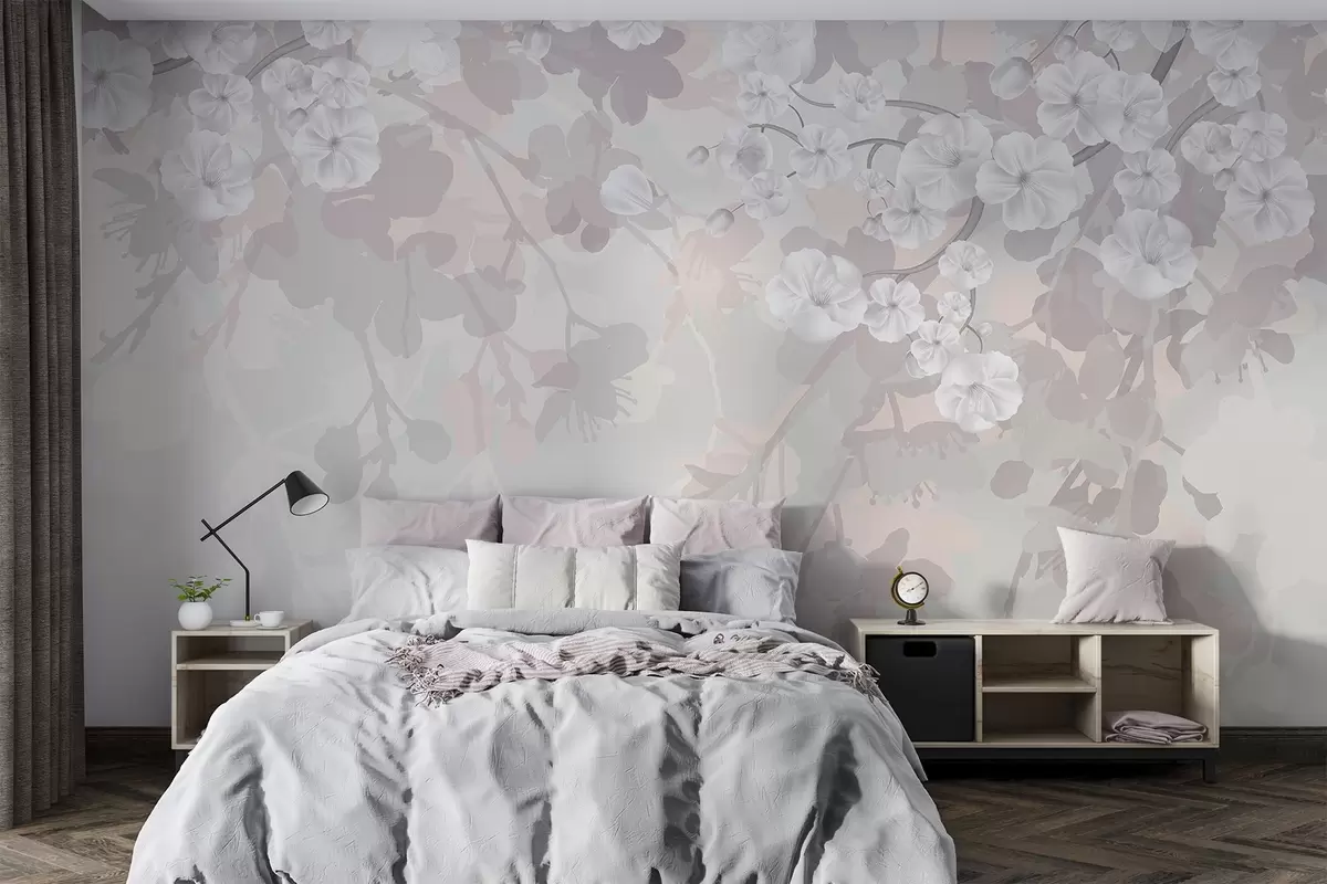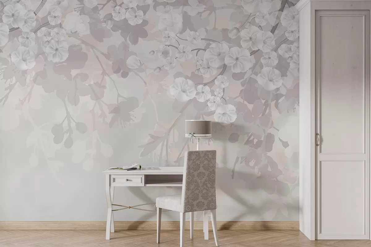 Fototapet Körsbärsblommans grenar med vita blommor och grå blad, på eleganta blomstersilhuetter i mjuka pastellfärger Nr. w08973v1