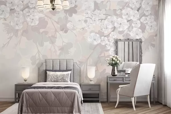 Fototapet Körsbärsblommans grenar med vita blommor och grå blad, på eleganta blomstersilhuetter i mjuka pastellfärger Nr. w08973v1