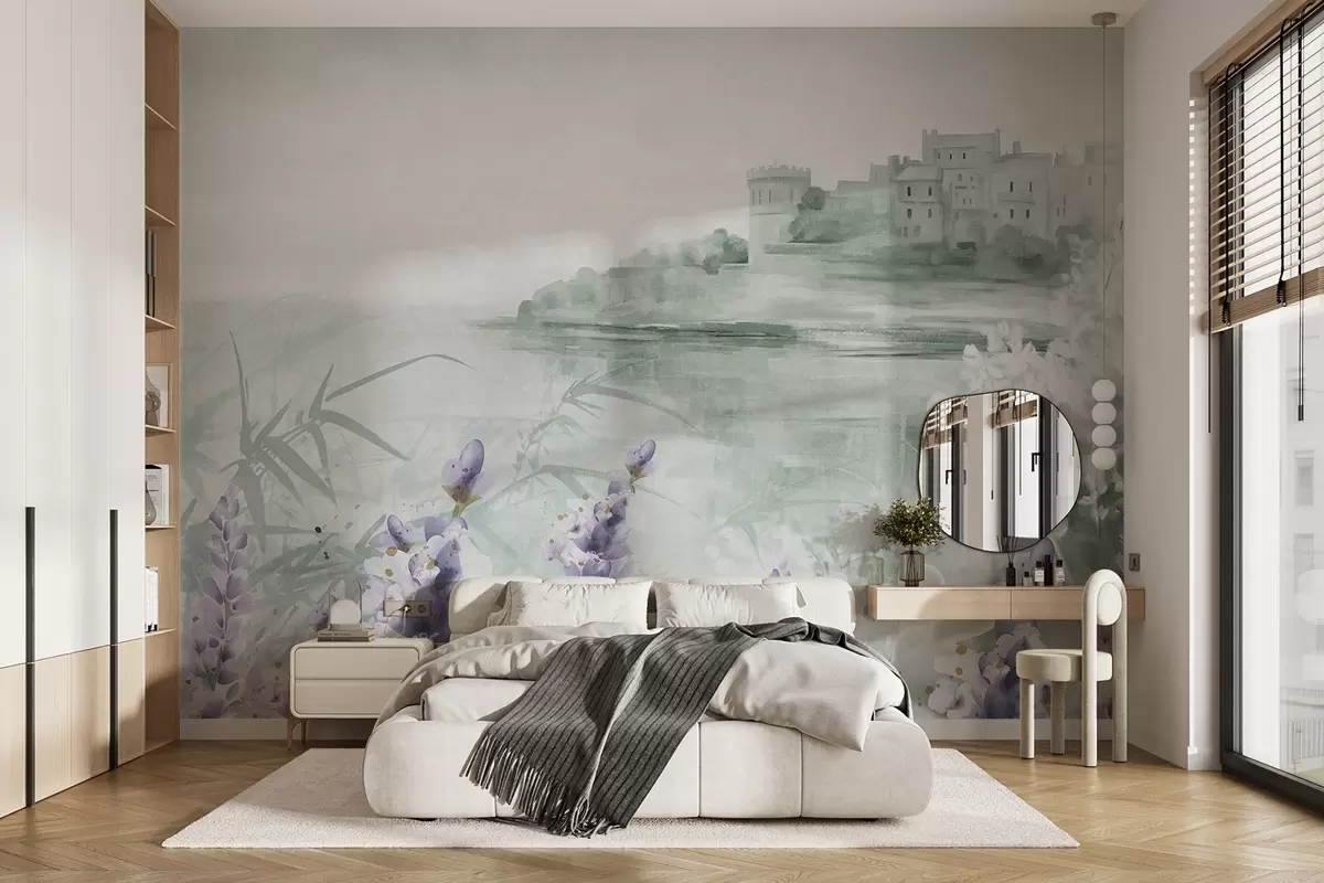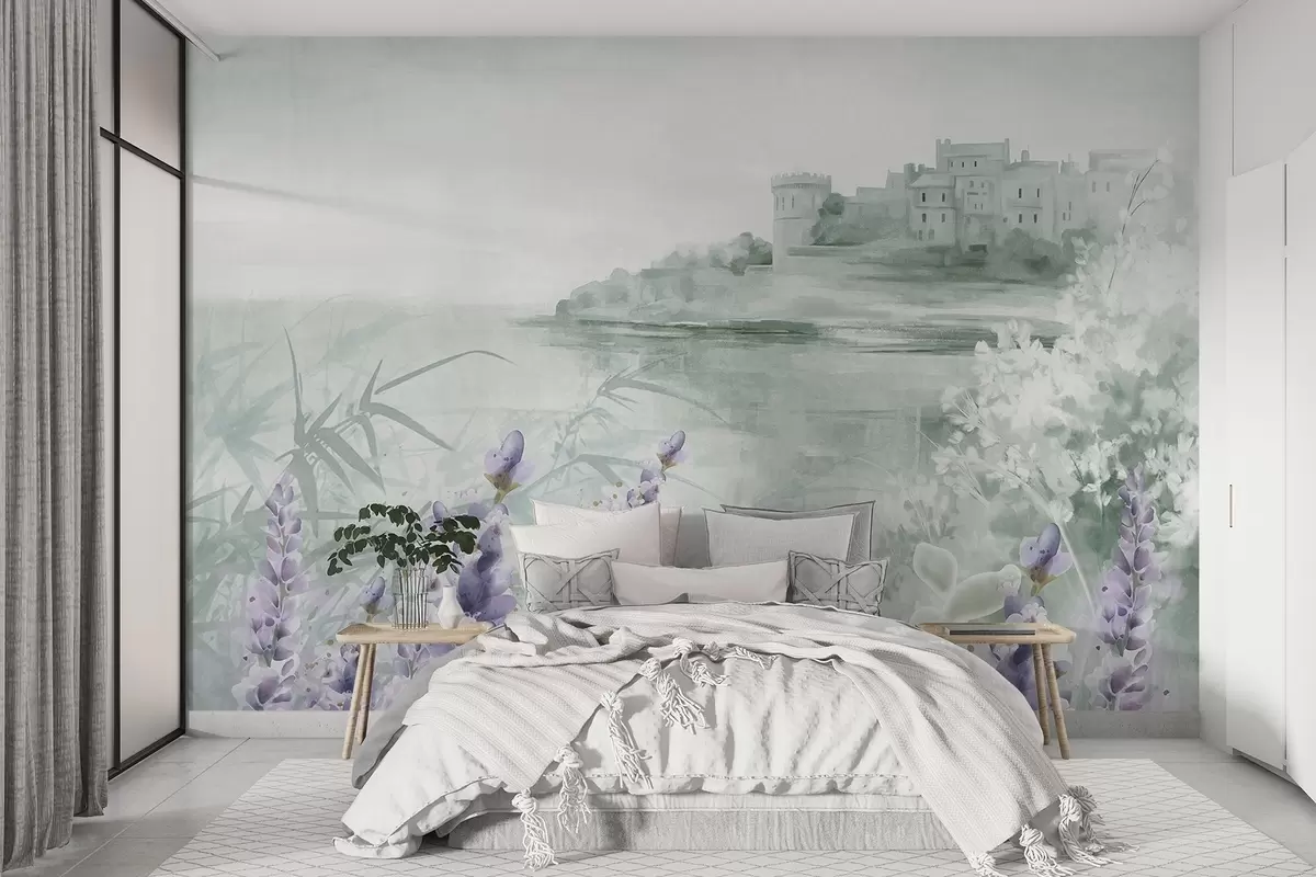 Fototapet Texturerat vintagelandskap med ett slott på en klippa med utsikt över havet, med lavendelblommor i dämpade färger Nr. w08975