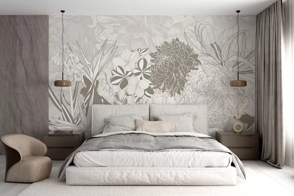 Fototapet Blommor och blad i beige toner, inklusive krysantemum, plumeria och tropiskt bladverk, botanisk design Nr. w08976