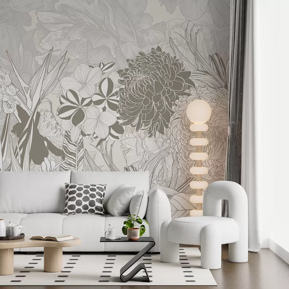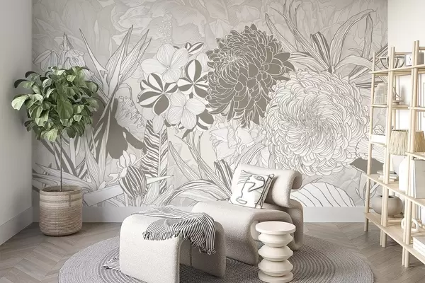 Fototapet Blommor och blad i beige toner, inklusive krysantemum, plumeria och tropiskt bladverk, botanisk design Nr. w08976