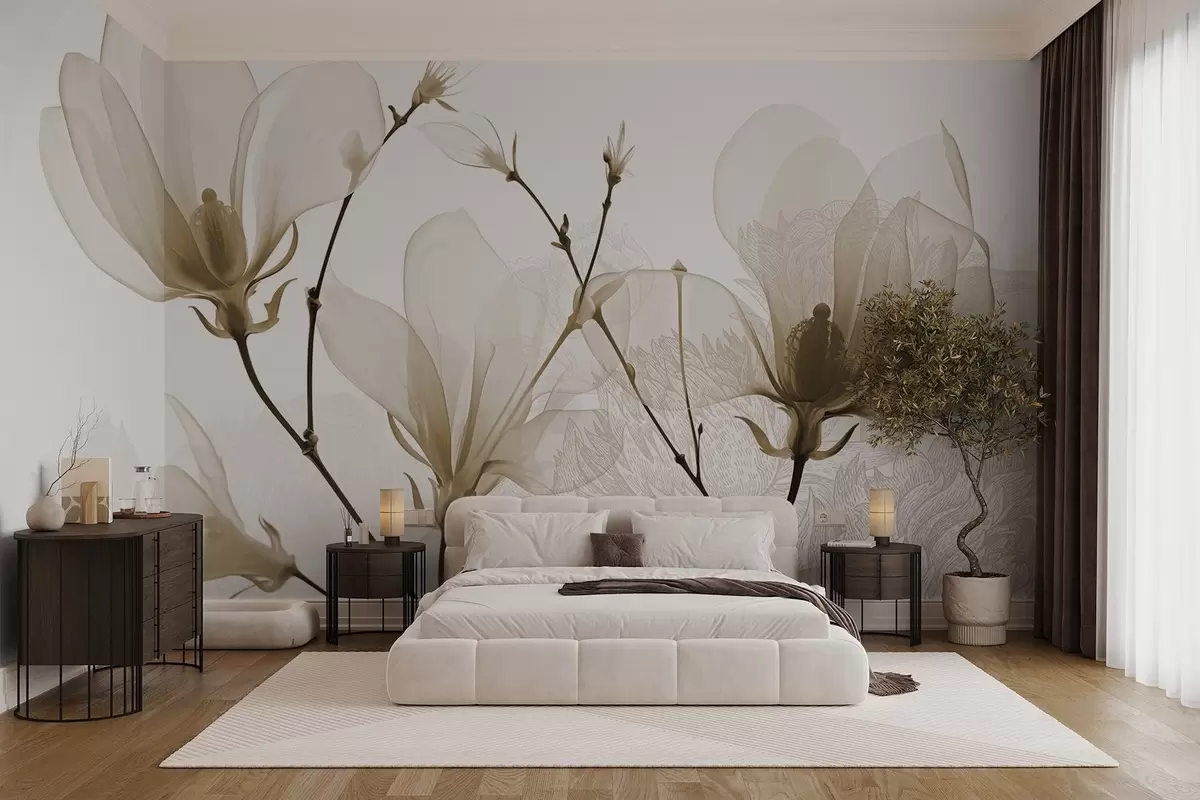 Fototapet Genomskinliga beige magnoliablommor med blomstersilhuetter med fina kronblad och mörka stjälkar Nr. w08978v1