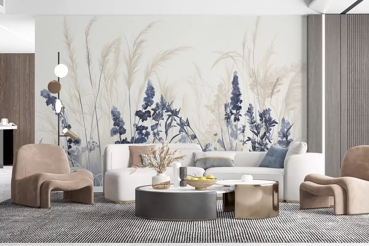 Fototapet Blå blommor och beige vass på ett fält, minimalistisk målningstextur, ljus bakgrund, mjuka färger, fina penseldrag Nr. w08982