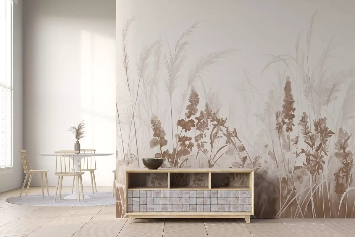 Fototapet Bruna blommor och beige vass på ett fält, minimalistisk målningstextur, ljus bakgrund, mjuka färger, fina penseldrag Nr. w08982v1