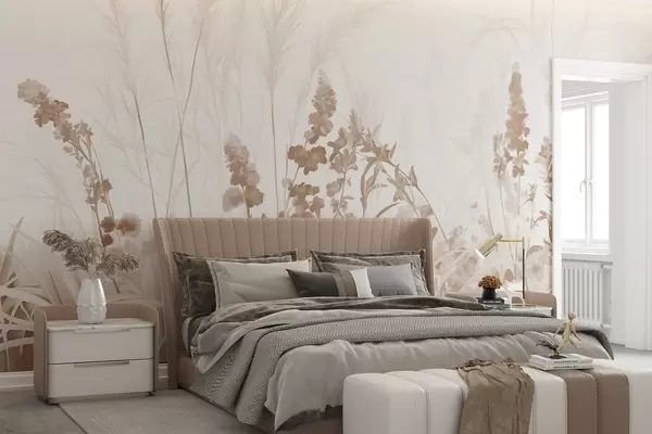 Fototapet Bruna blommor och beige vass på ett fält, minimalistisk målningstextur, ljus bakgrund, mjuka färger, fina penseldrag Nr. w08982v1