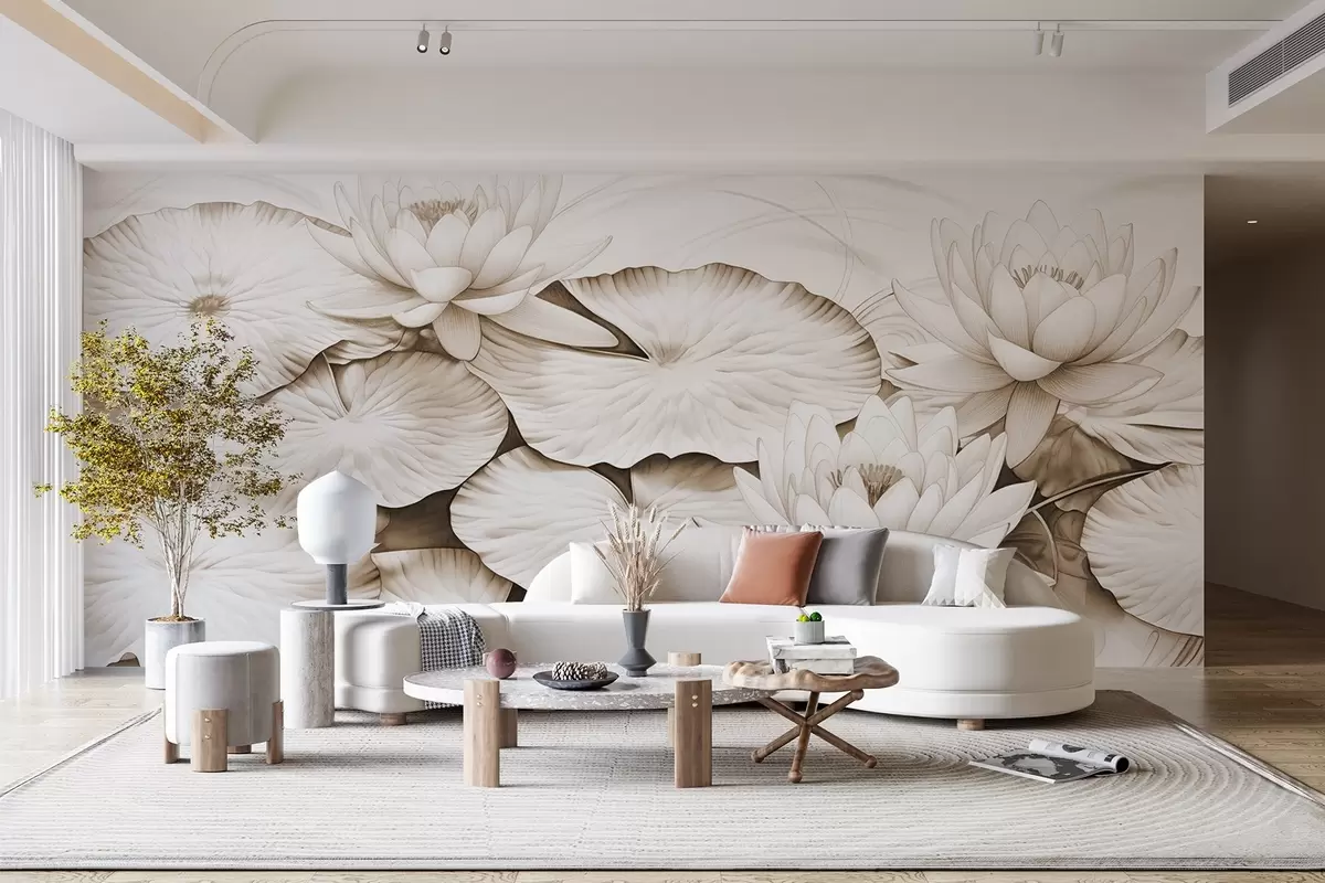 Fototapet Näckrosor och näckrosblad i en damm, brunvit imitation av blyertsteckning, detaljerad botanisk illustration, naturkonst Nr. w09006v2