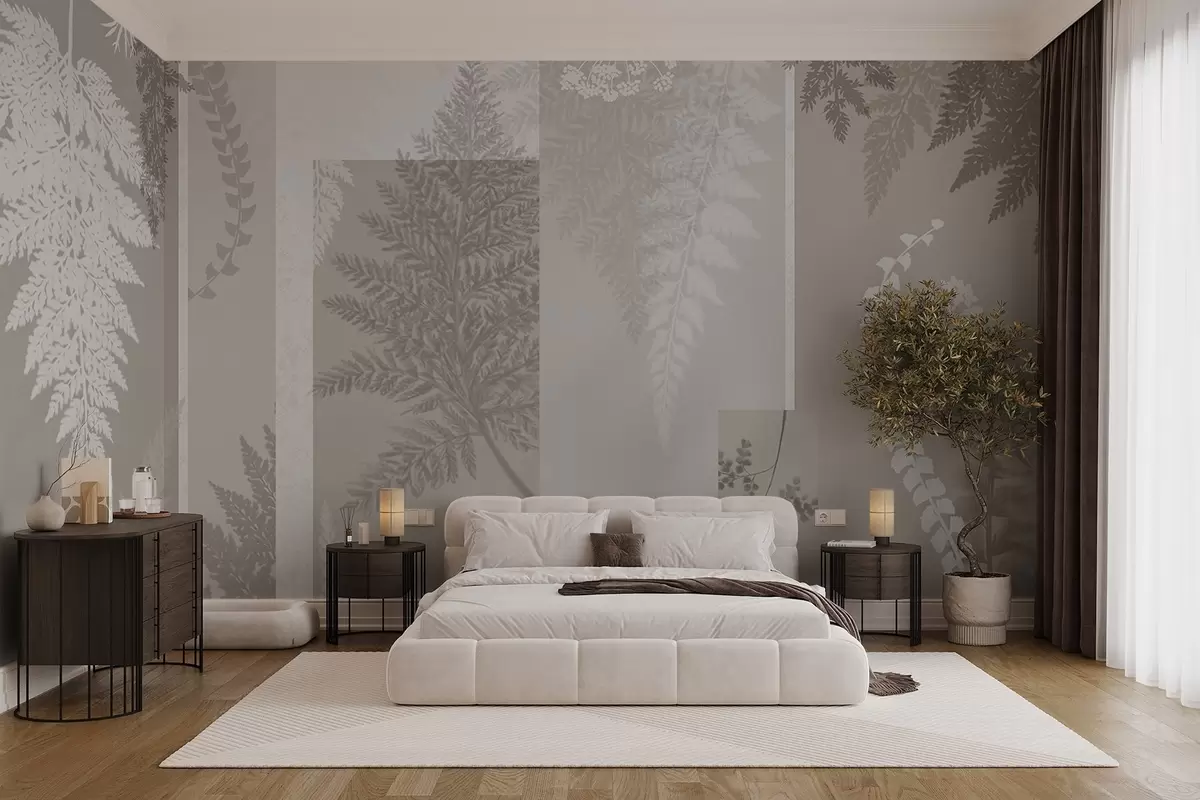 Fototapet Ormbunksblad i beige och vitt, arrangerade i vertikala ränder, vilket skapar ett botaniskt och minimalistiskt tryck, mjuka och dämpade färger Nr. w09007