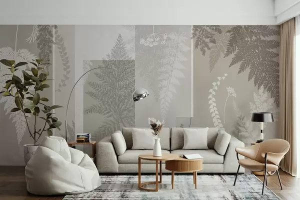 Fototapet Ormbunksblad i beige och vitt, arrangerade i vertikala ränder, vilket skapar ett botaniskt och minimalistiskt tryck, mjuka och dämpade färger Nr. w09007