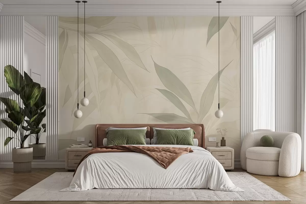 Fototapet Grenar med blad i mjuka gröna toner på en beige bakgrund Nr. w09027
