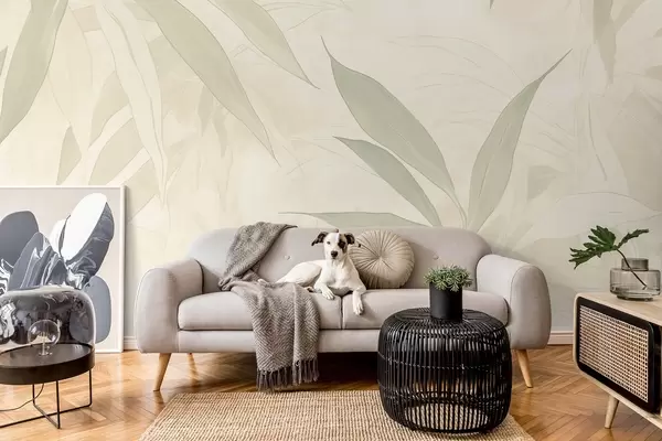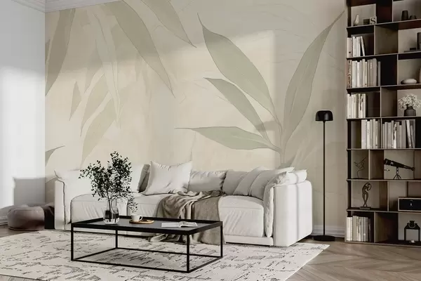 Fototapet Grenar med blad i mjuka gröna toner på en beige bakgrund Nr. w09027