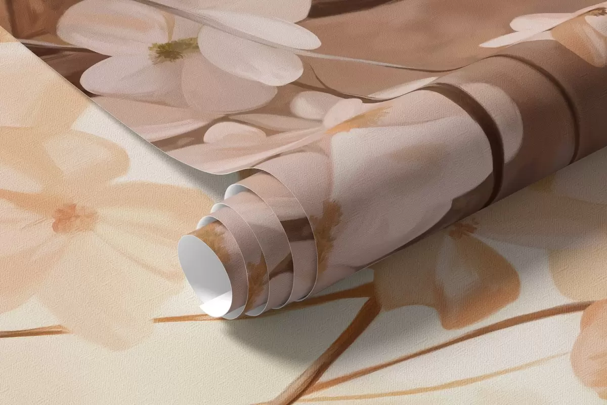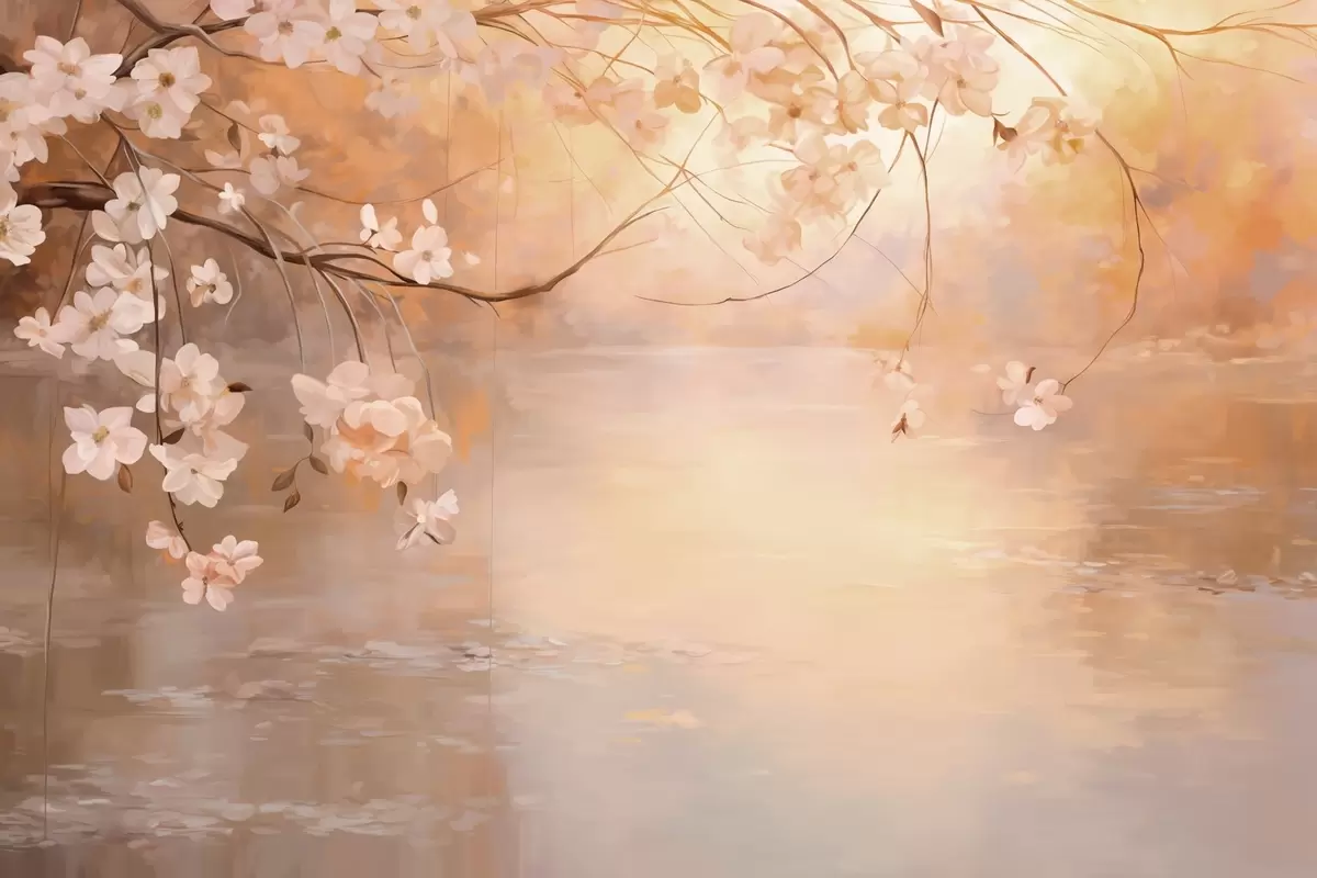 Fototapet Abstrakt landskapskonst med blommande gren och vita blommor som hänger över en sjö, mjuka pastellfärger Nr. w09046