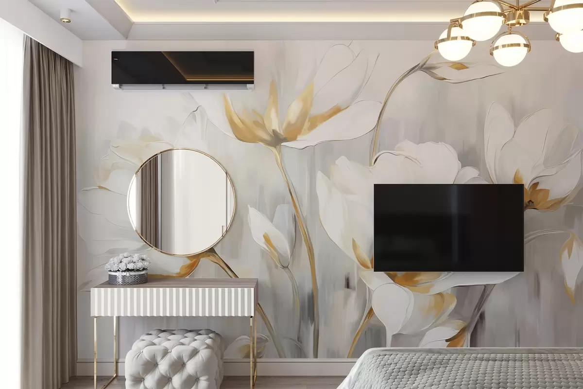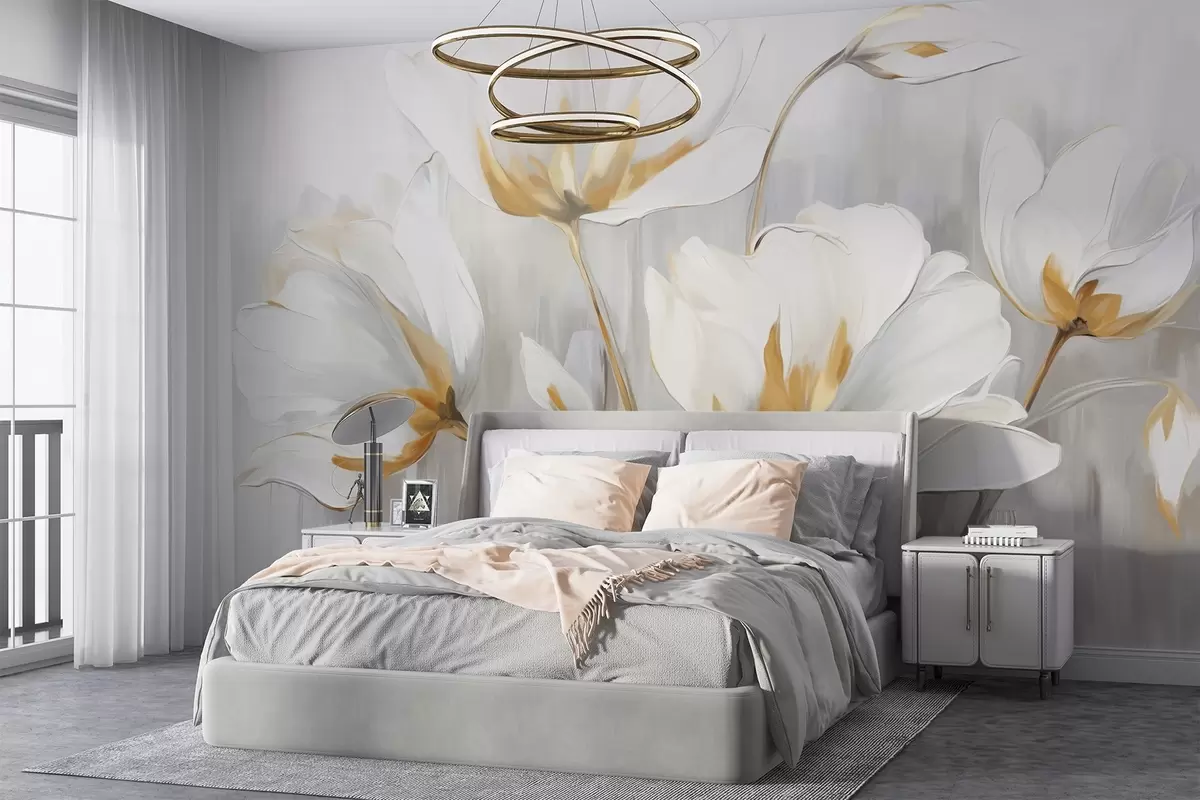 Fototapet Vita abstrakta blommor med vita kronblad och stjälkar på en grå bakgrund med grå och vita vertikala penseldrag Nr. w09047