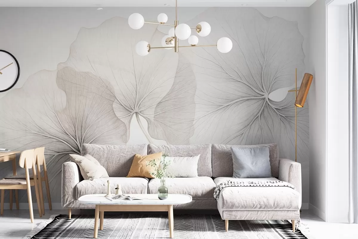 Fototapet Tre genomskinliga blad med synliga vener, med brusstruktur som överlappar varandra något, med tunna stjälkar på en vit bakgrund Nr. w09052
