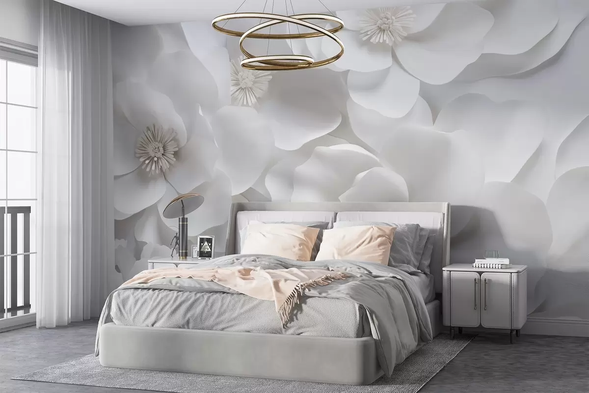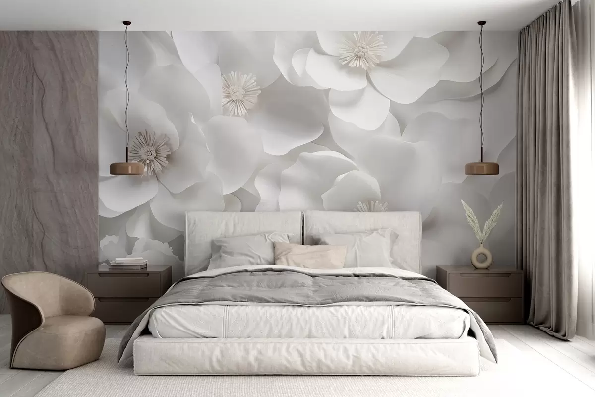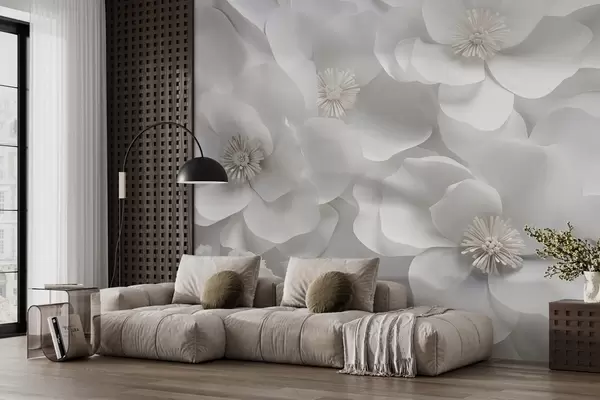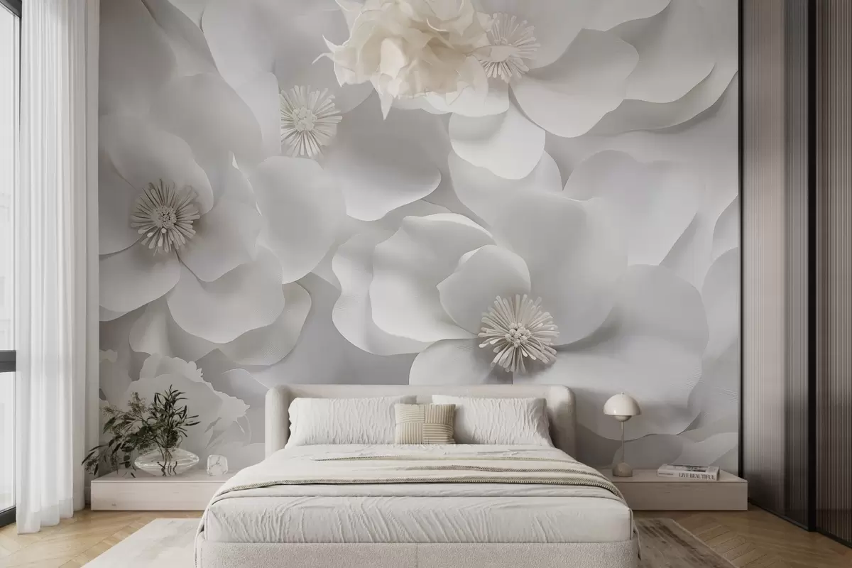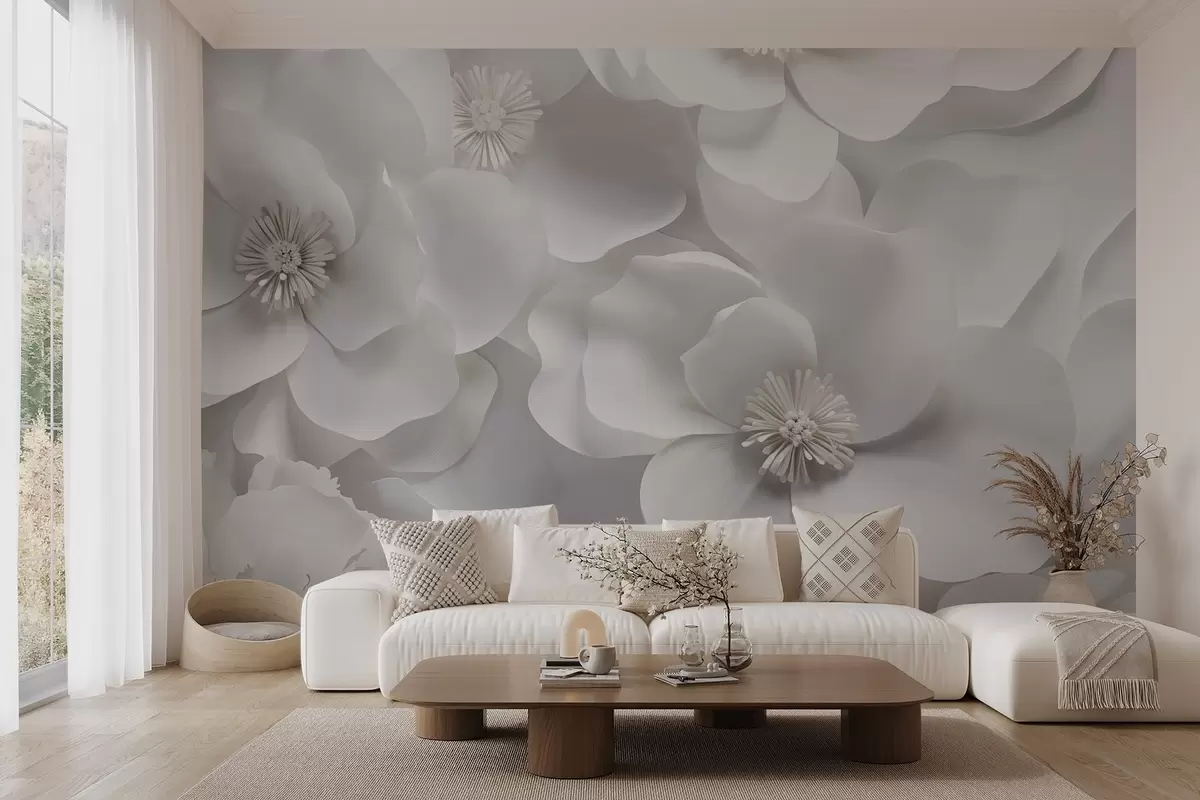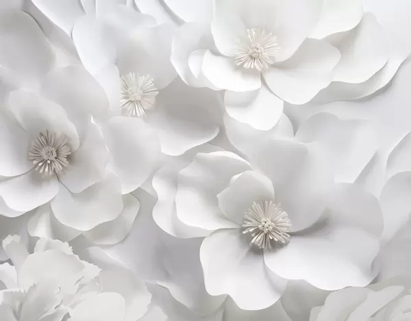 Fototapet Vita blommor med fina kronblad, arrangerade i ett tätt kluster, vilket skapar en känsla av renhet och elegans på vit bakgrund Nr. w09053