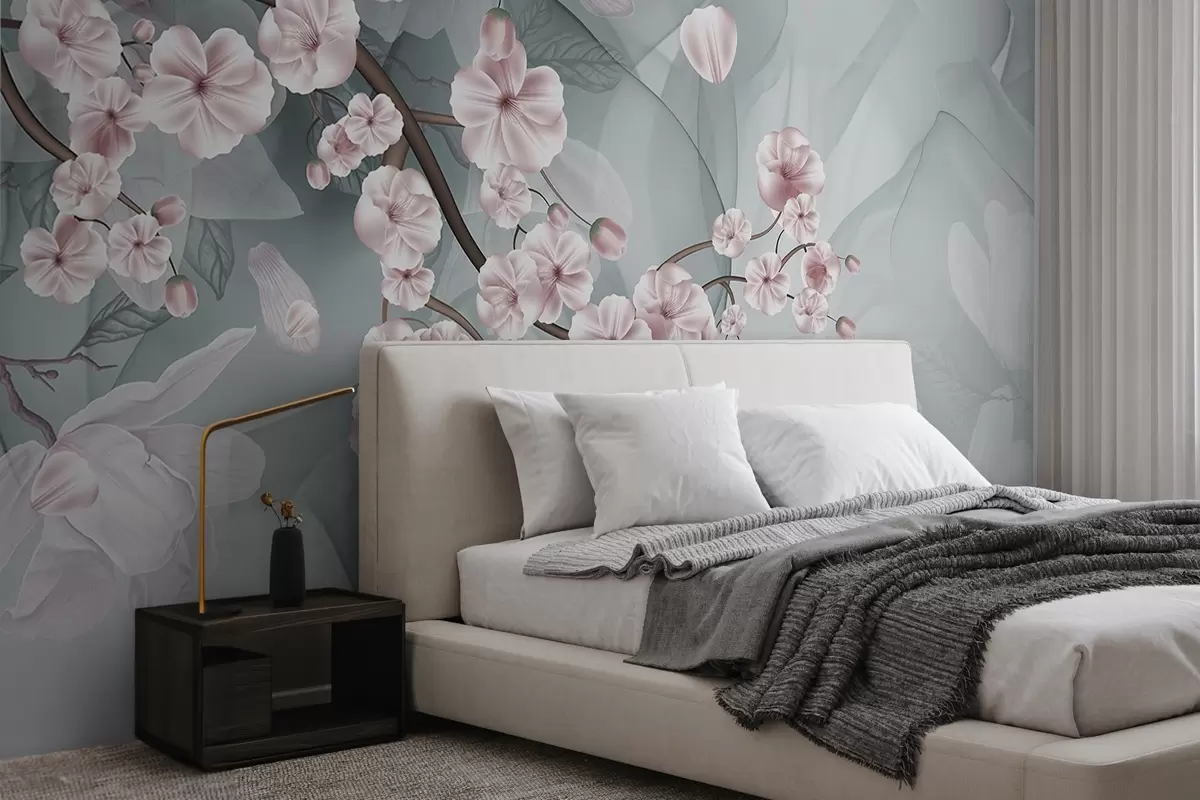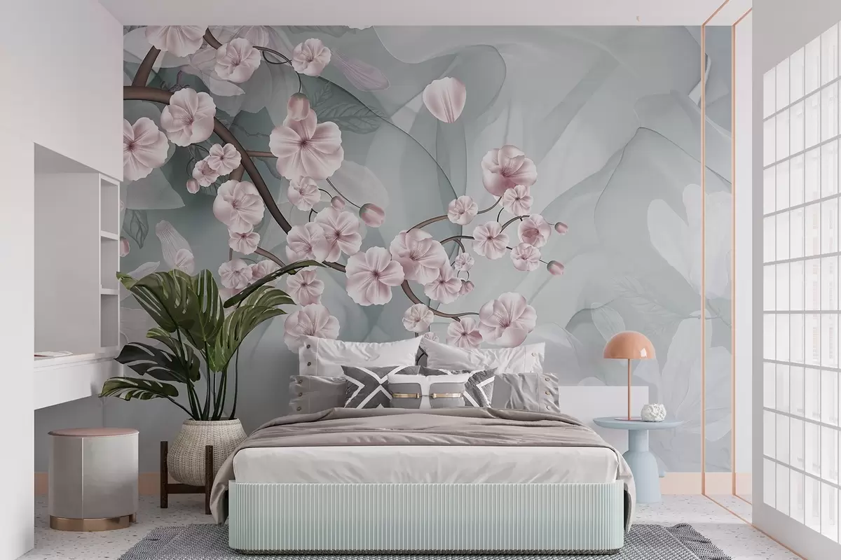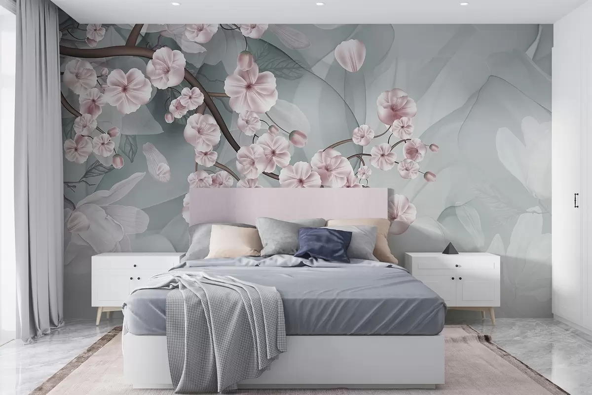 Fototapet Körsbärsblommans grenar med rosa blommor och kronblad, bruna grenar, abstrakt dämpad bakgrund med flödande effekt Nr. w09054